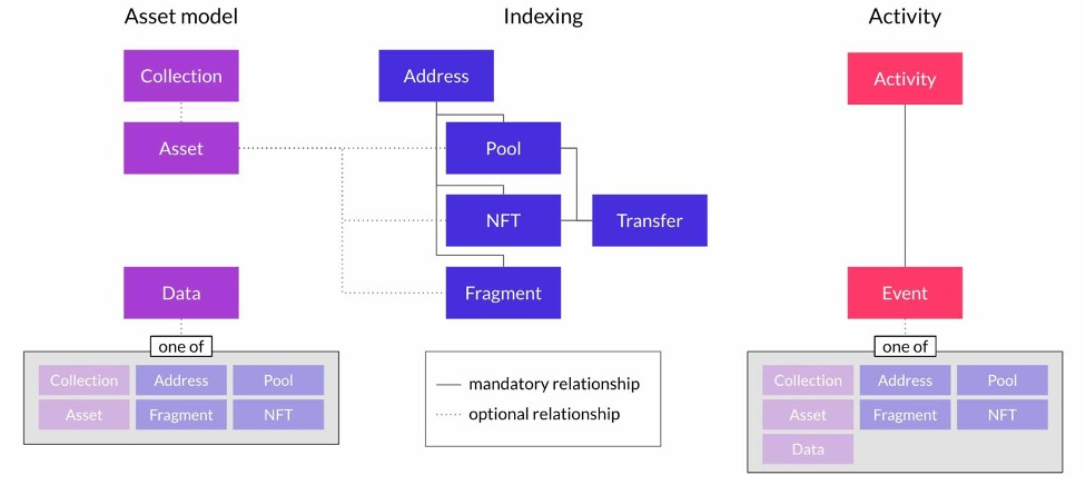 These represent the audit trail. Every action flowing through the platform, whether from an invocation workflow or detected by the Indexing Engine, produces an Activity record associated with an Event. The Event references the specific entity it relates to: a Collection, Address, Pool, Asset, Fragment, or NFT. This gives you a complete, queryable history of everything that has happened across your entire asset portfolio.