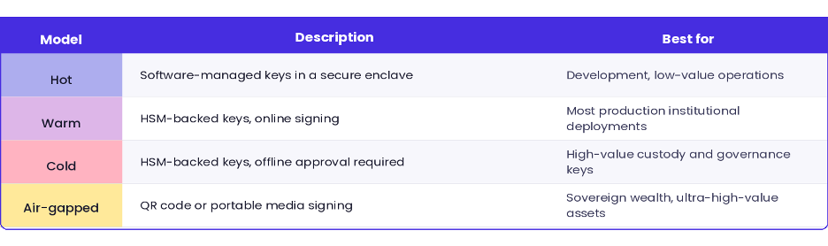 Kaleido does not generate or hold private keys on behalf of customers under any deployment model. Keys are generated within the customer's chosen secure environment. In HSM-backed configurations, generation occurs within the hardware security boundary. This is a foundational design principle, not a configuration option.