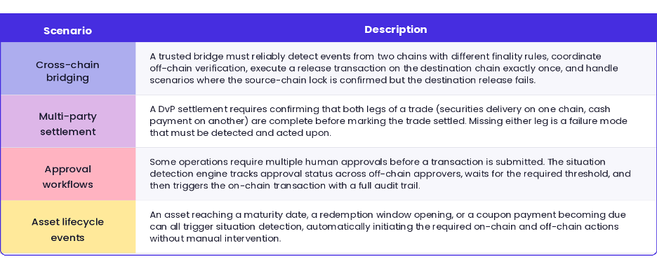 Standard indexing ("when event X fires, do Y") is sufficient for simple use cases. But many enterprise digital asset scenarios require coordinating multiple on-chain and off-chain events across multiple parties, with conditional logic, error handling, and exactly-once execution semantics.