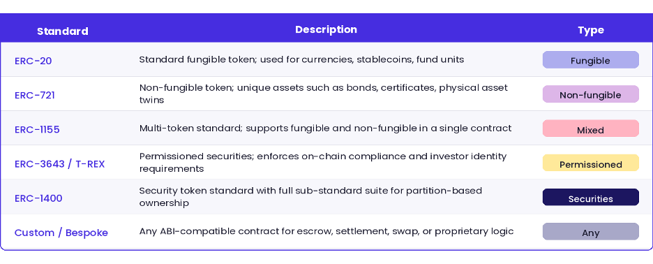 Digital Assets supports a broad set of token standards out of the box. The platform is also smart contract agnostic: any ABI-compatible contract can be uploaded to generate a typed REST API, meaning your invocation and indexing workflows can be built around any on-chain logic you deploy.