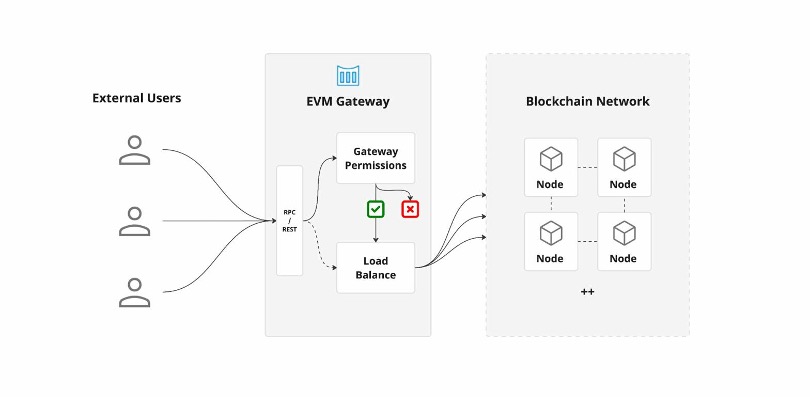 Figure 3. The EVM Gateway enforces permissions and distributes load across the blockchain node pool before requests reach the chain.