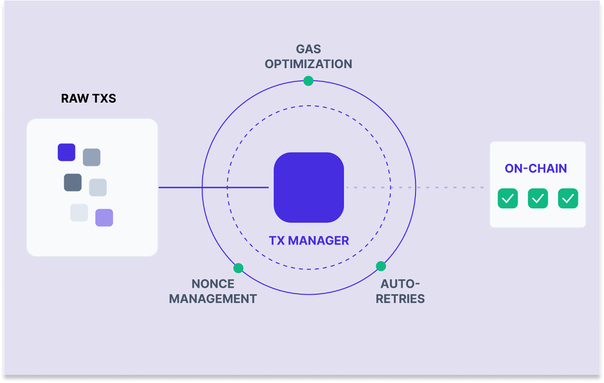 Figure 4. The Transaction Manager handles nonce sequencing, gas optimization, and automatic retries so application code does not need to manage these details directly.